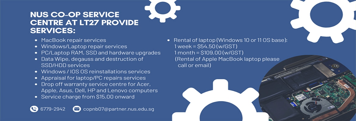 Established in 1969, NUS Co-op is a retail store with a few outlets located in NUS Kent Ridge. Its business includes university apparel/souvenirs, books, stationery, drinks, titbits, gifts, medical/nursing products, computers, IT accessories, IT repairs/support and printing services.